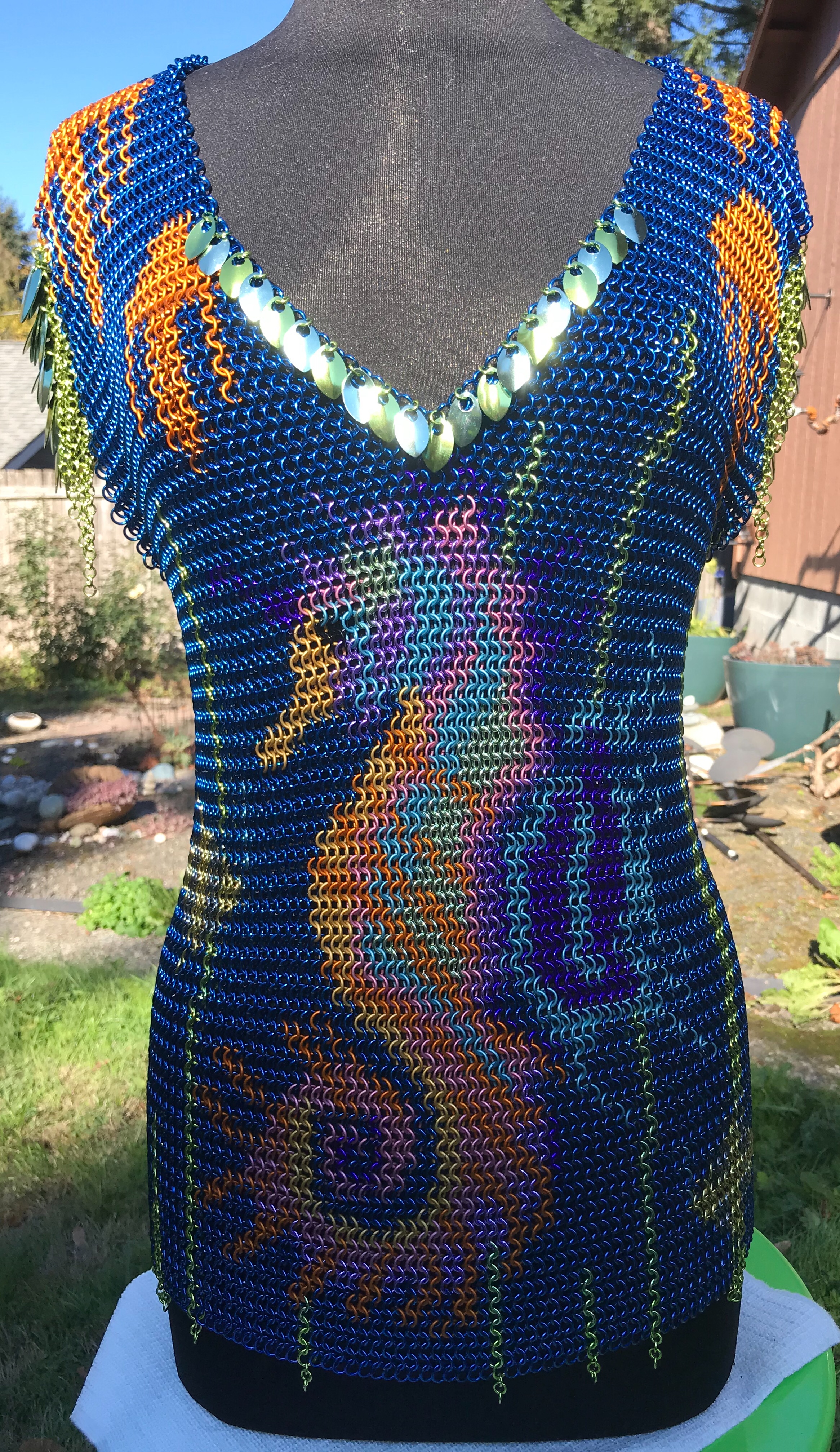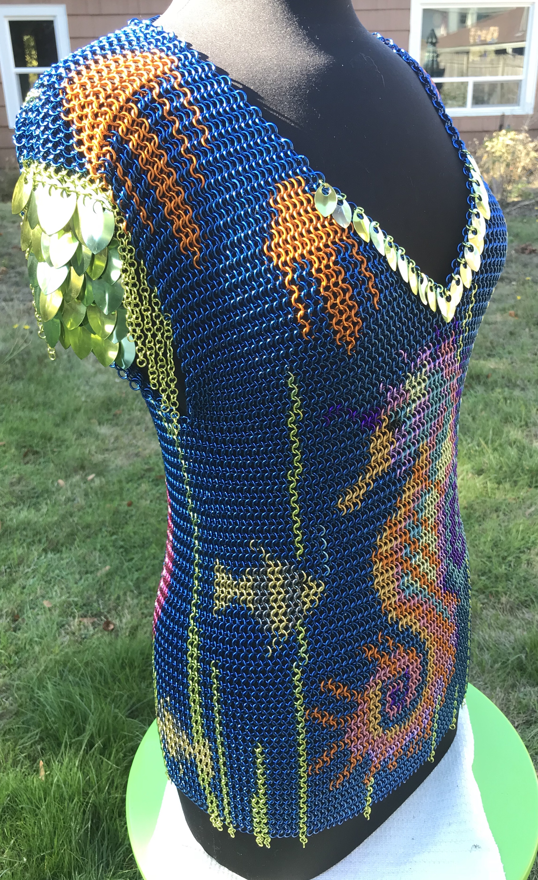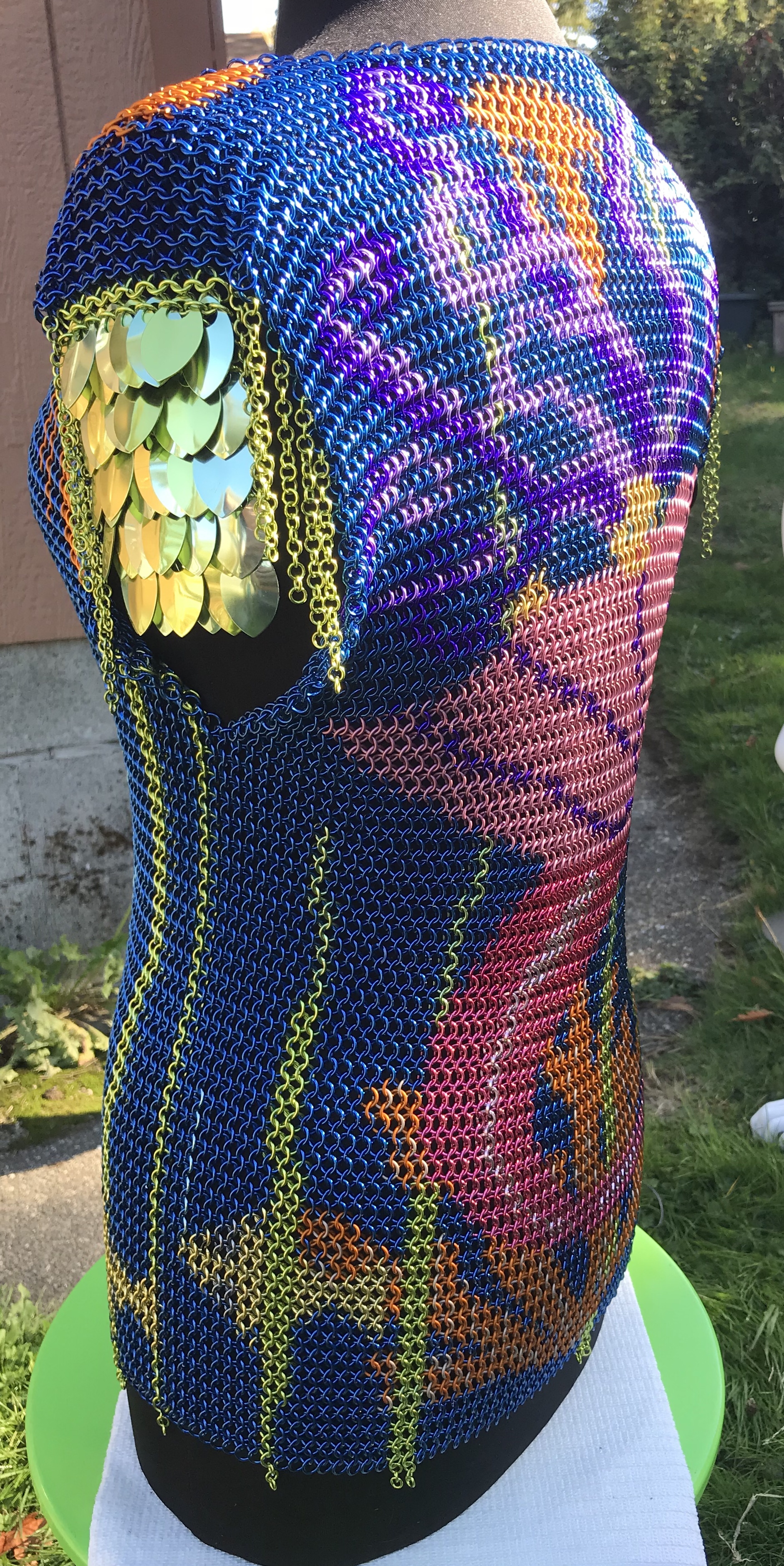 Named for the new owner, this is our favorite Hauberk to date. 8 weeks, 16,885 rings of 1/4″ 16 gauge anodized aluminum, 500 rings of 5/32″ 18 gauge, 80 large scales, 20 smaller scales, and a whole lot of obsessive “just a few more rows!”