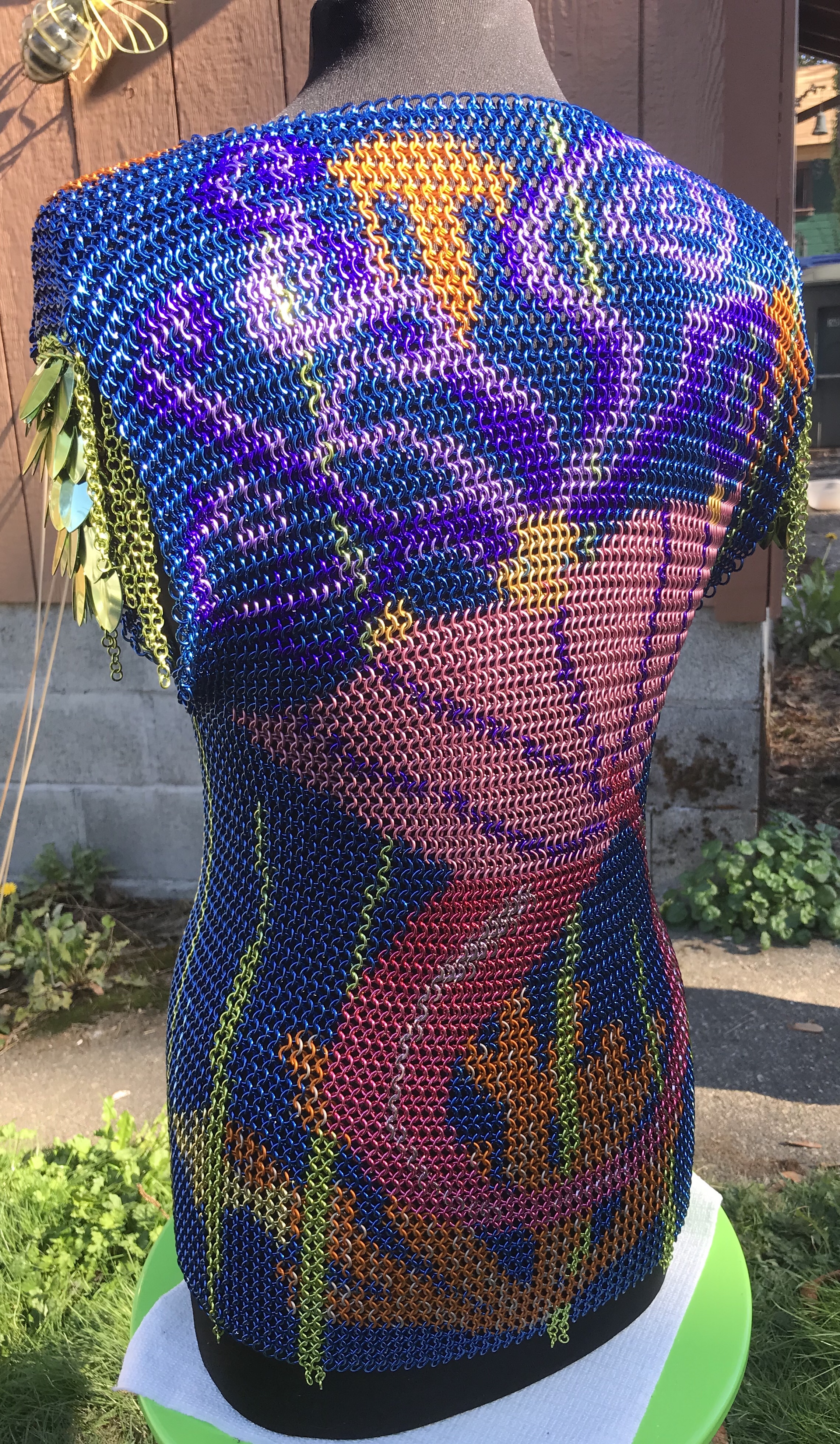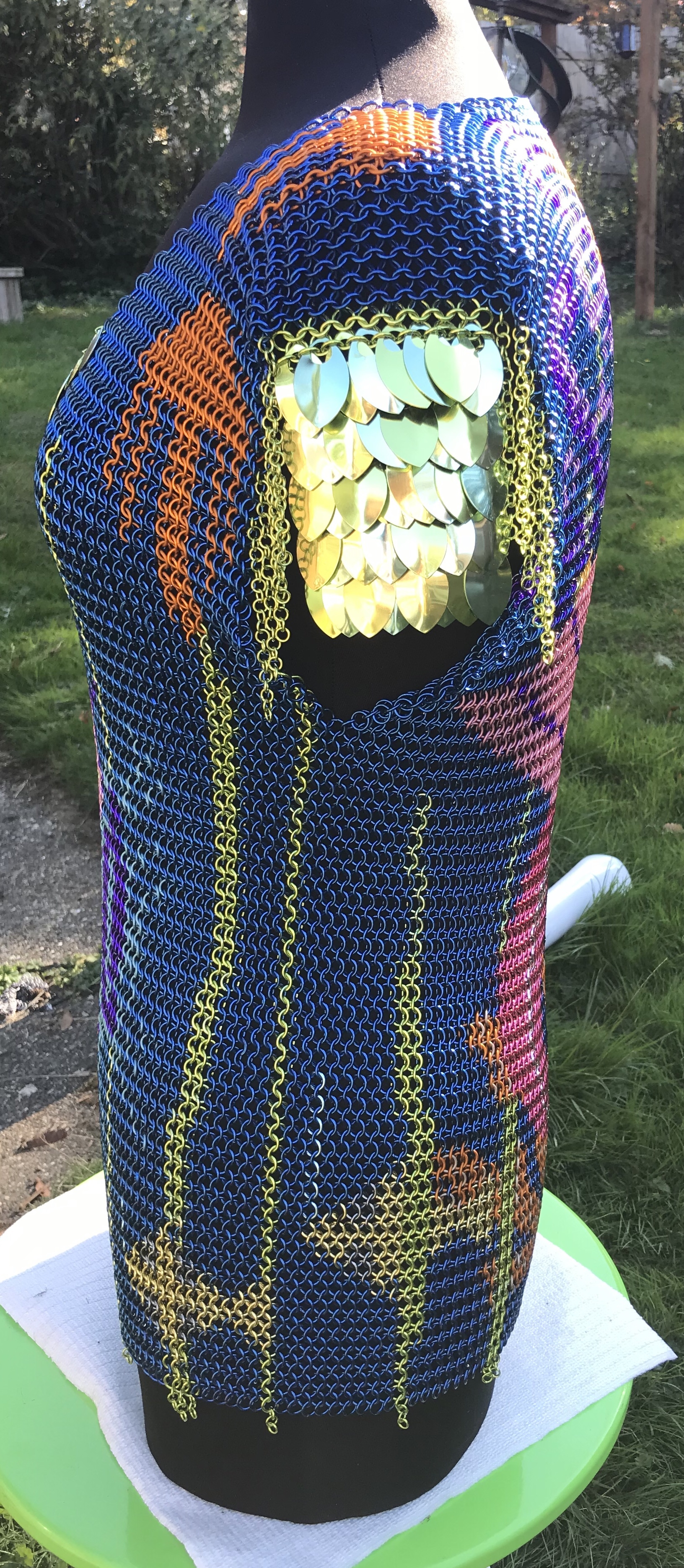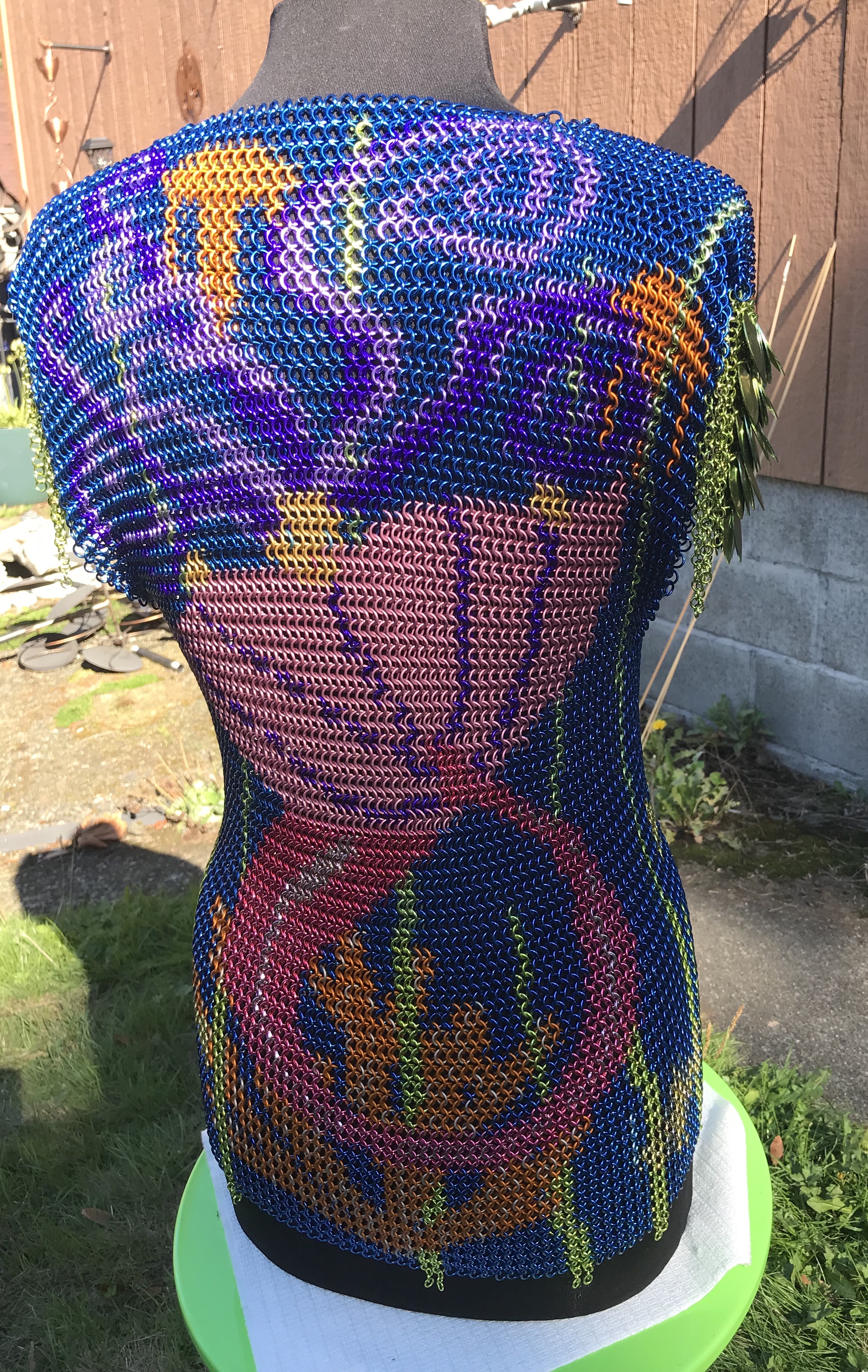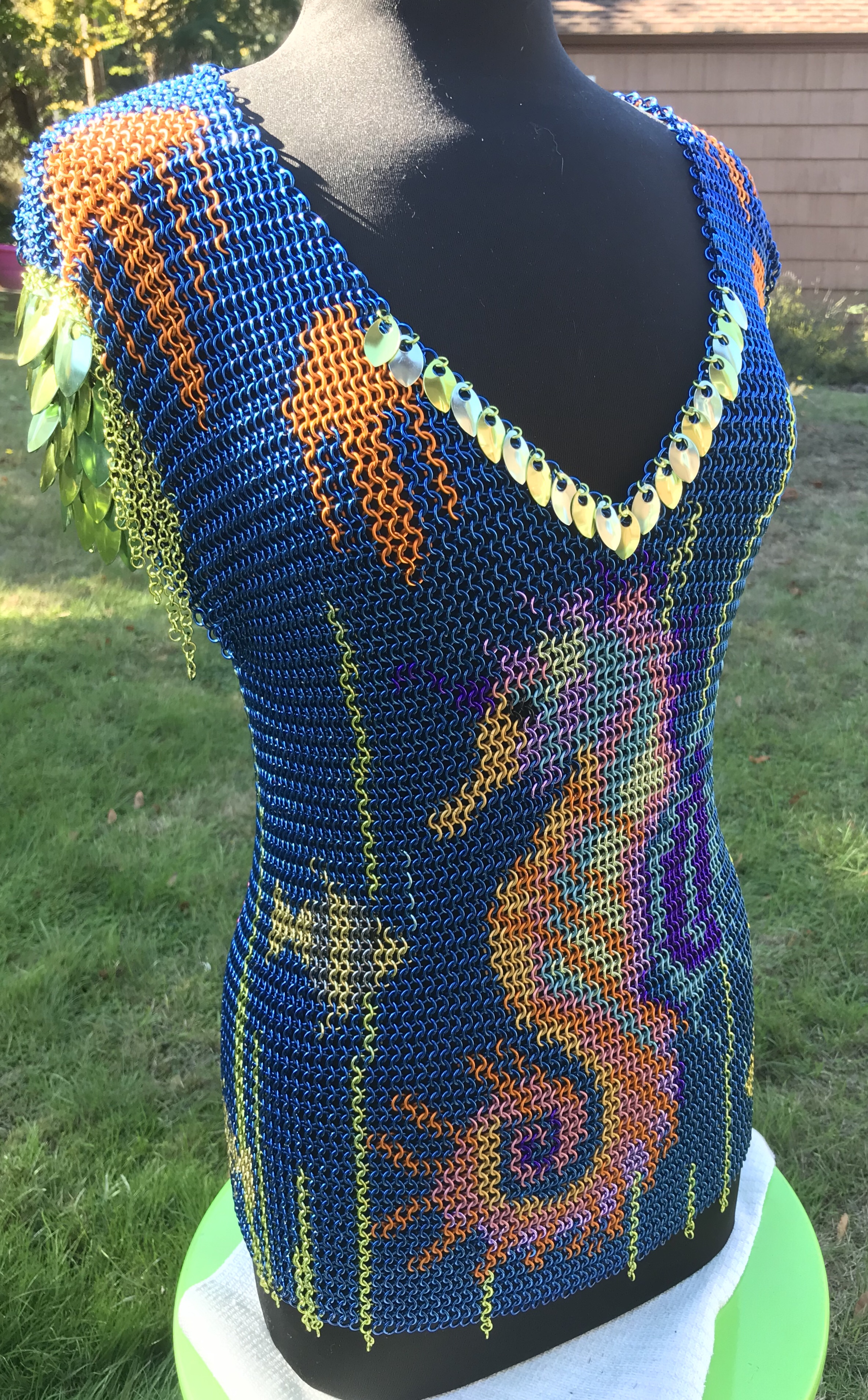 Named for the new owner, this is our favorite Hauberk to date. 8 weeks, 16,885 rings of 1/4″ 16 gauge anodized aluminum, 500 rings of 5/32″ 18 gauge, 80 large scales, 20 smaller scales, and a whole lot of obsessive “just a few more rows!”