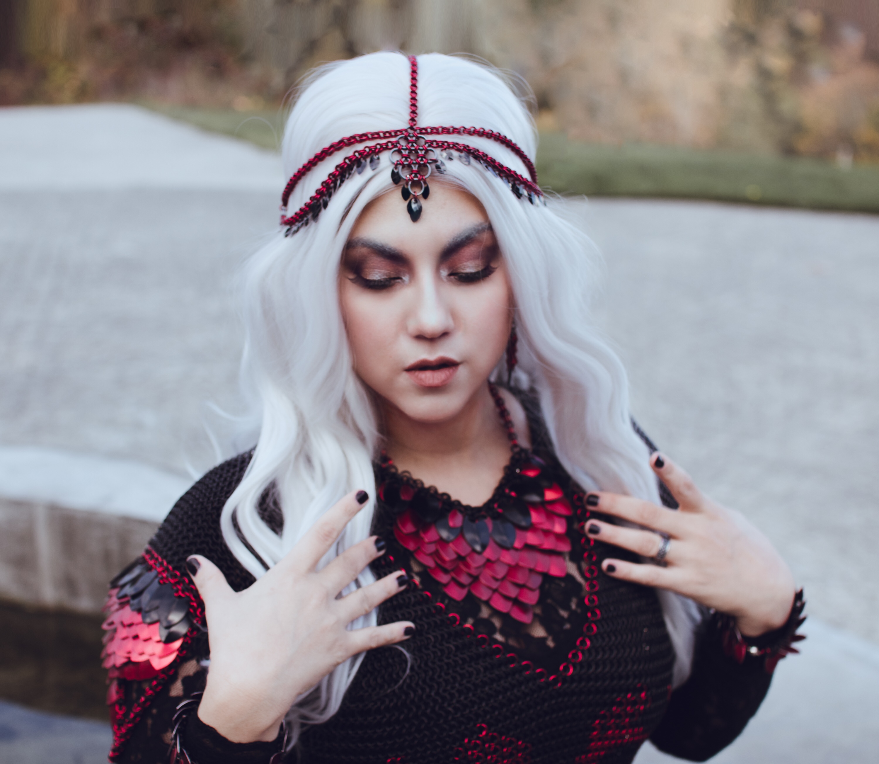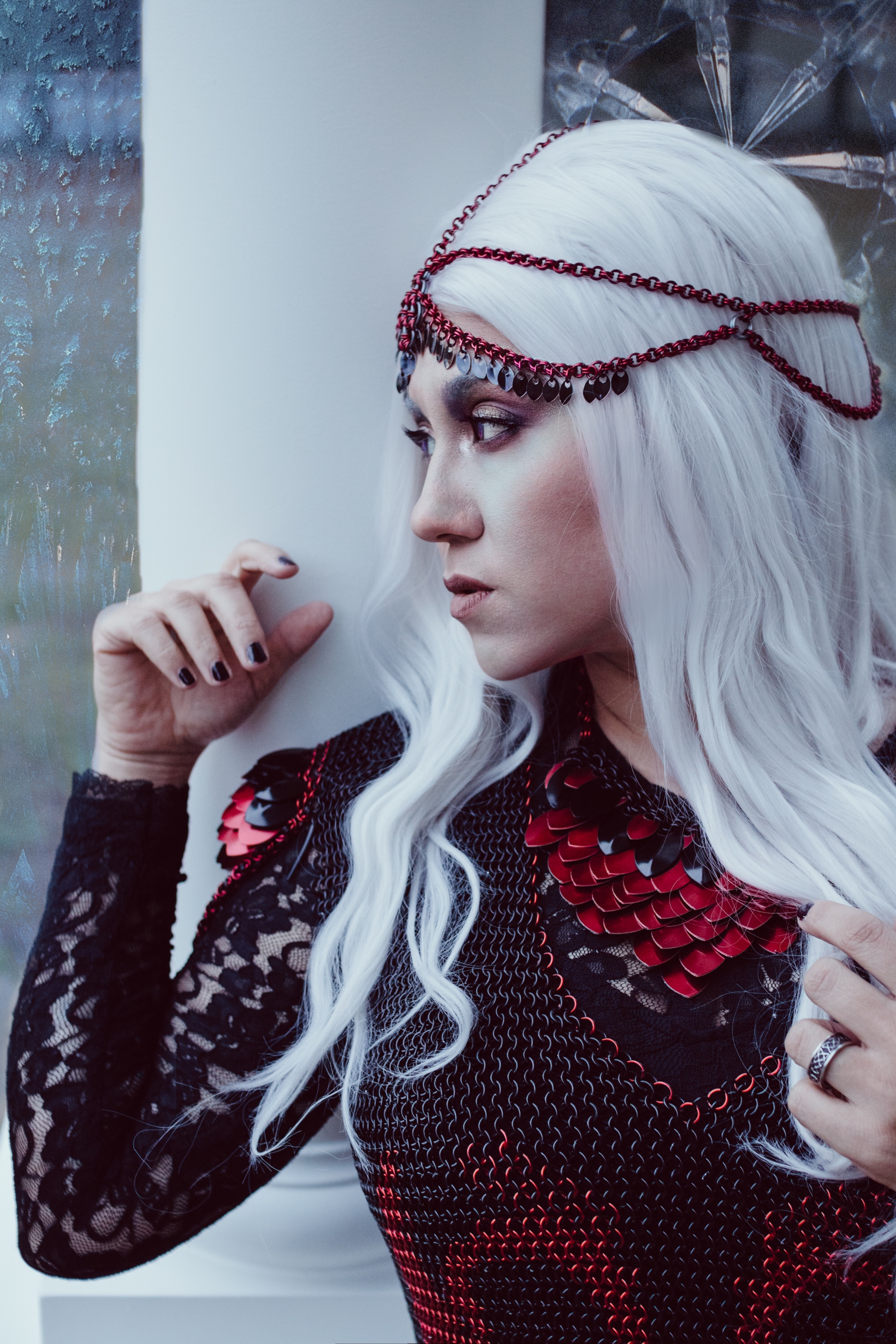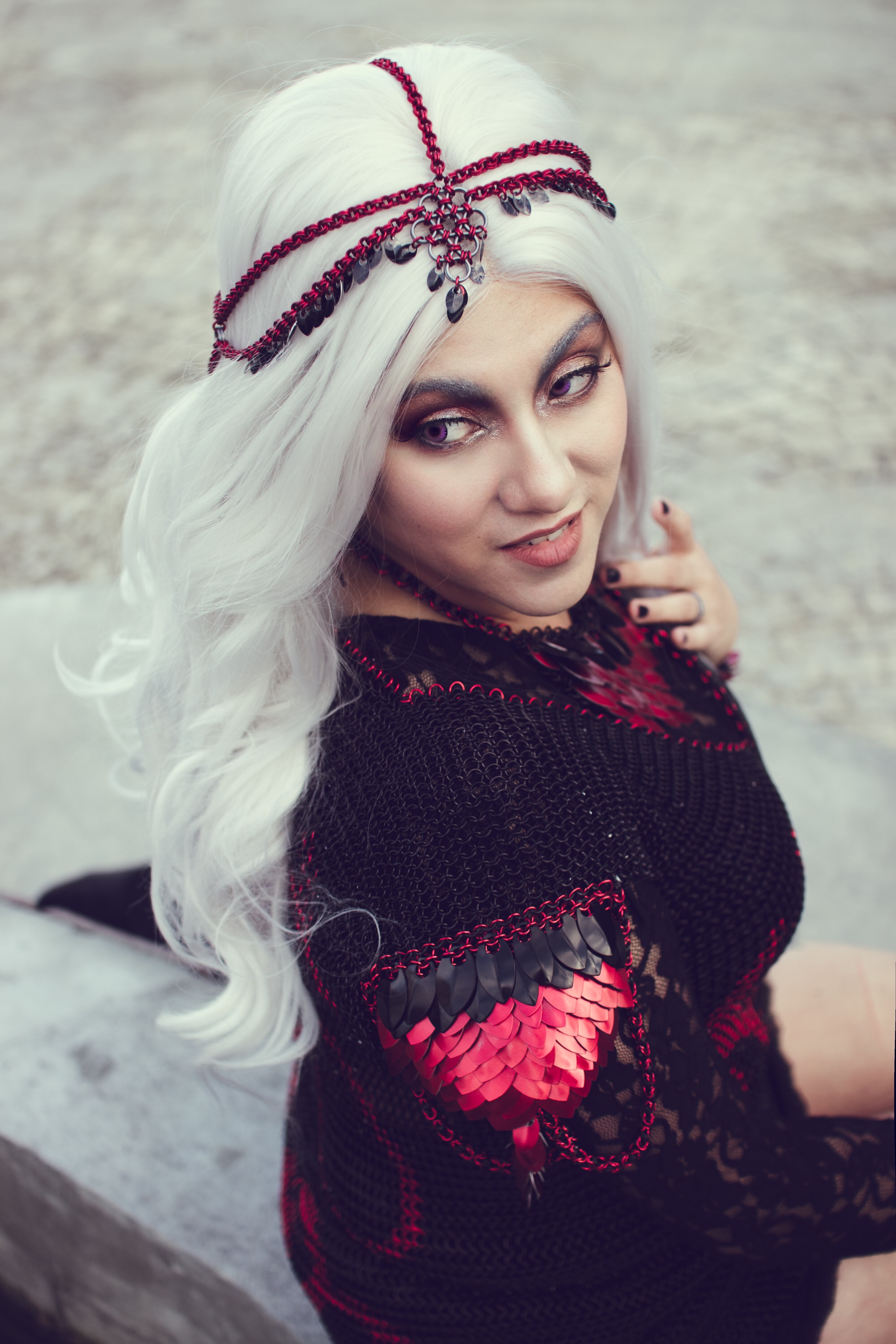 We can NOT get over this look! This is DragonHeart, finally modeled by its owner #aeonjane of #studiofrontstreet. As a professional photographer, it takes a little time to get the chance to step in front of the camera, but when you are this talented and beautiful, it’s worth waiting for. This was the first patterned shirt we ever made, and the drama of it shines in these photos. Right before the photo shoot, she asked us for a diadem, for a more royal look, and doesn’t she look incredible? We take credit only for the chainmaille – the photography, poses, EVERYTHING about these pictures is all thanks to Jane, #studiofrontstreet ! Incredible