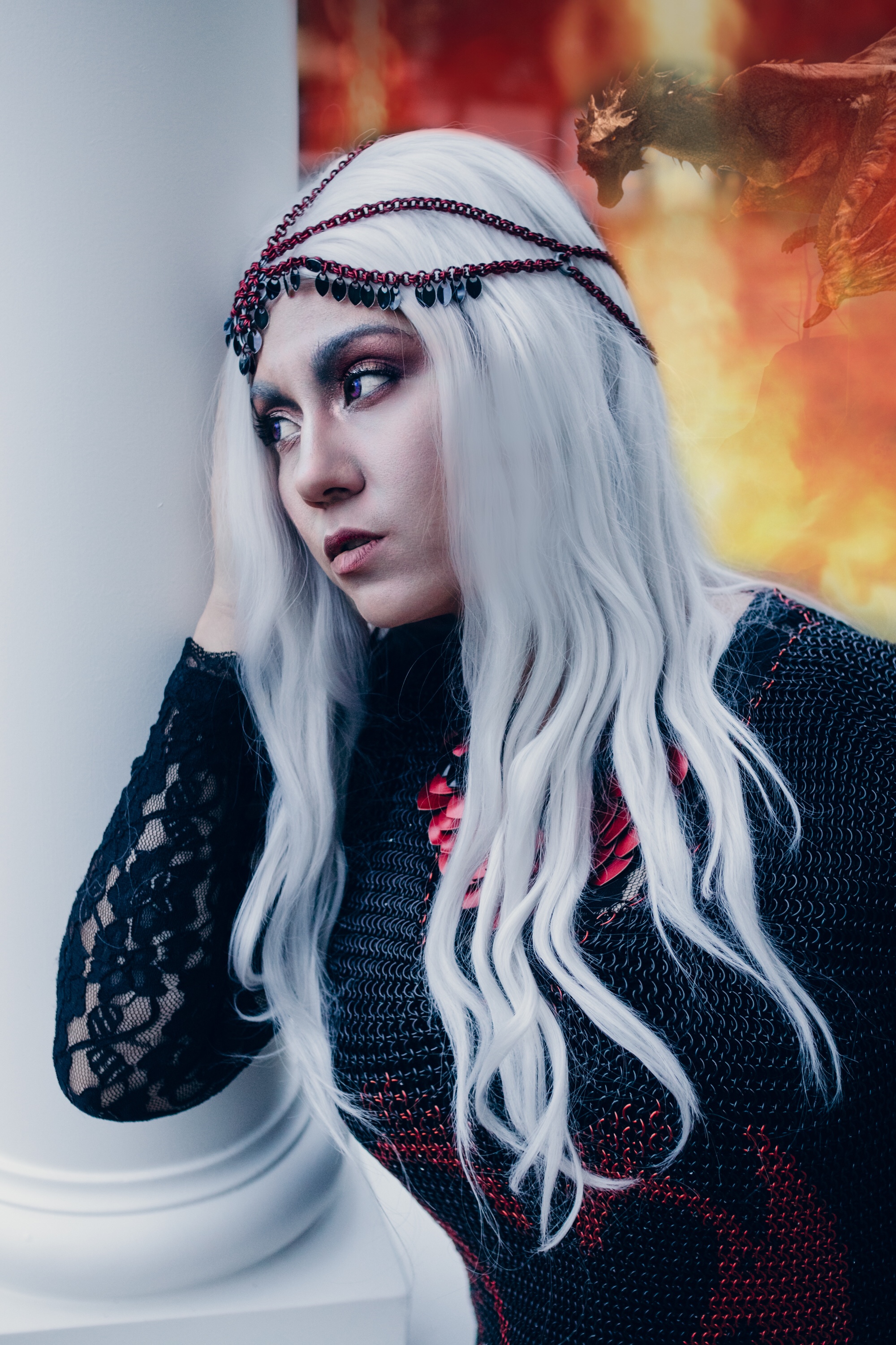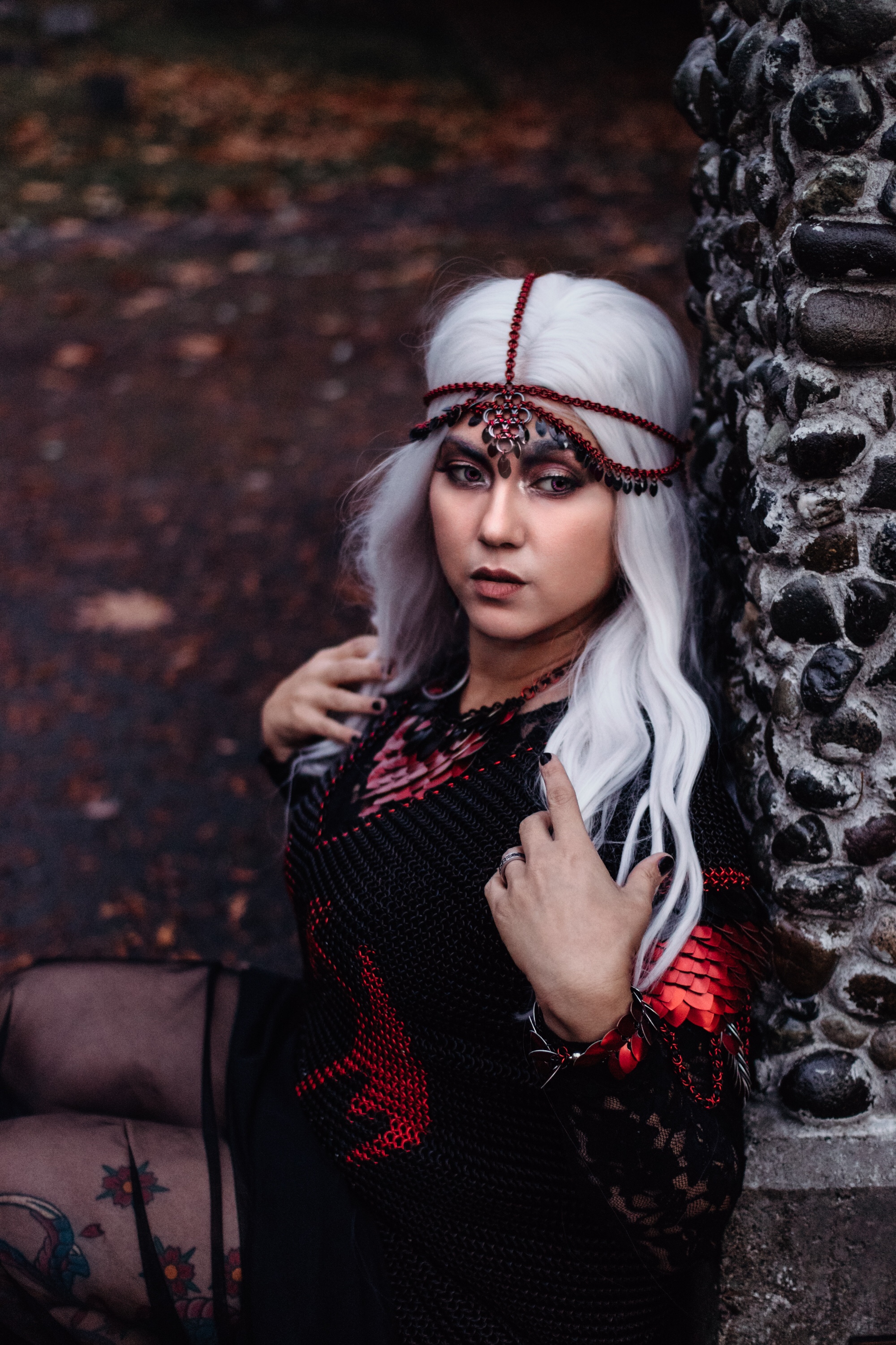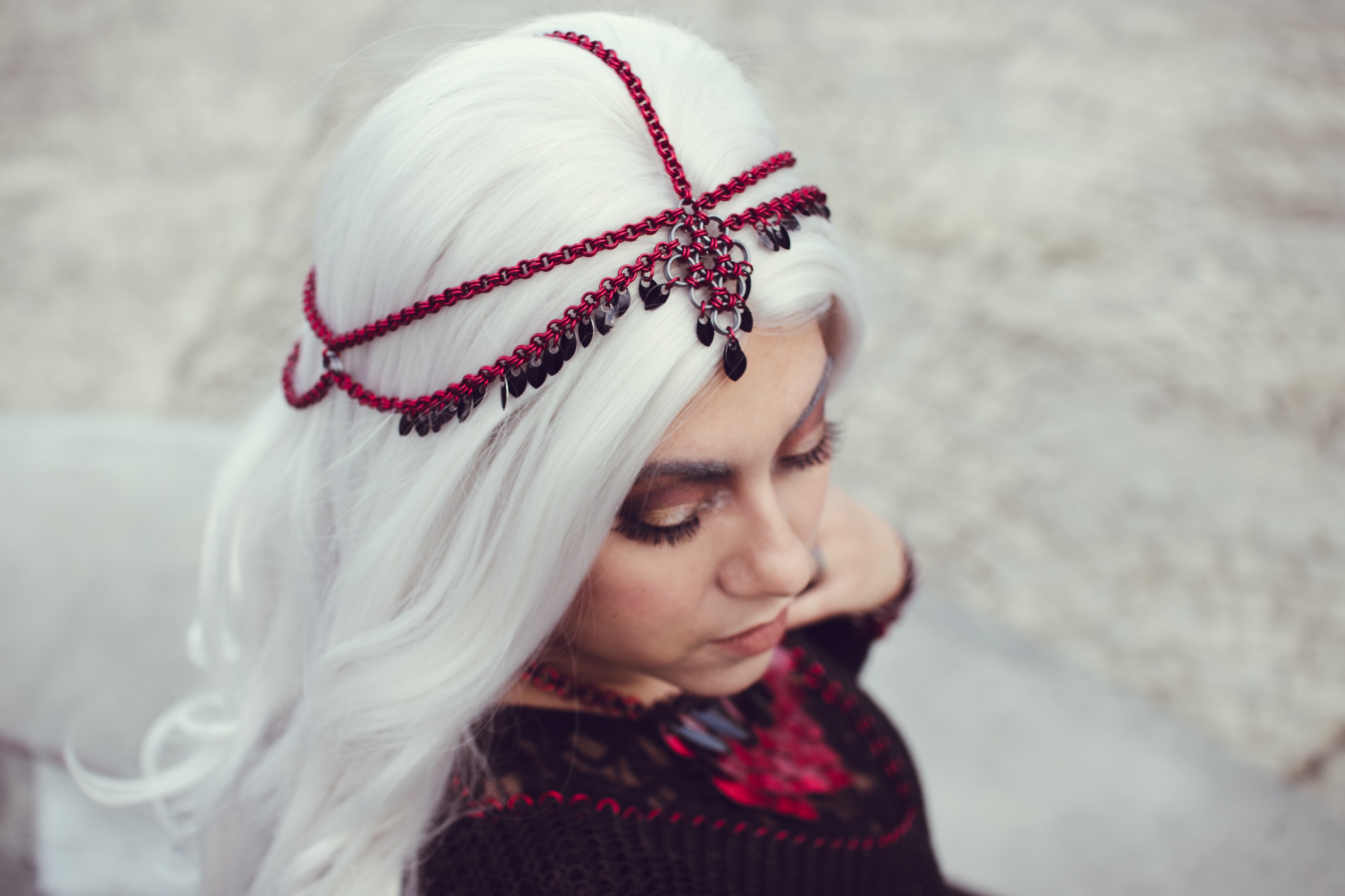 We can NOT get over this look! This is DragonHeart, finally modeled by its owner #aeonjane of #studiofrontstreet. As a professional photographer, it takes a little time to get the chance to step in front of the camera, but when you are this talented and beautiful, it’s worth waiting for. This was the first patterned shirt we ever made, and the drama of it shines in these photos. Right before the photo shoot, she asked us for a diadem, for a more royal look, and doesn’t she look incredible? We take credit only for the chainmaille – the photography, poses, EVERYTHING about these pictures is all thanks to Jane, #studiofrontstreet ! Incredible
