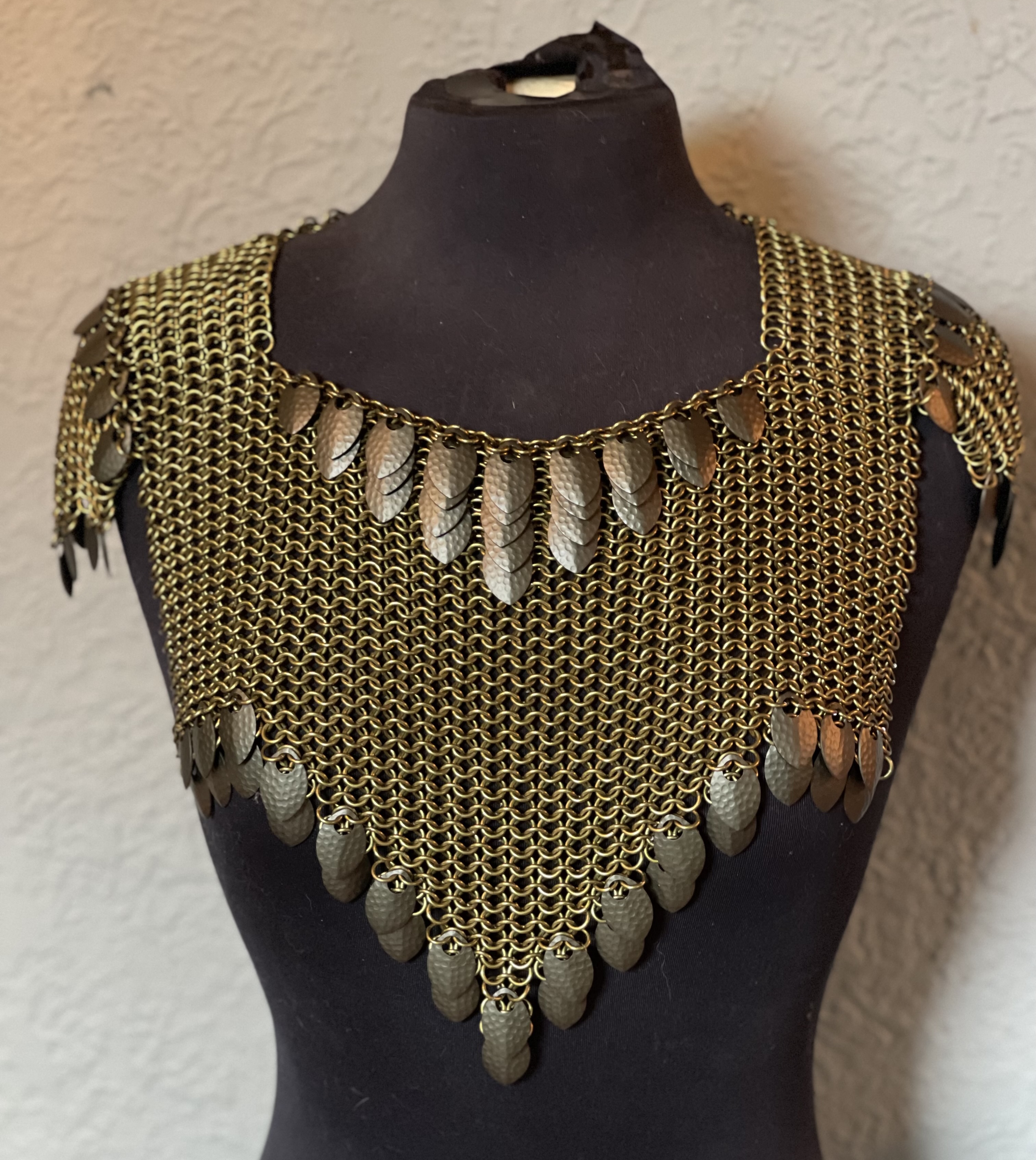 Olive European 4-in-1 Chainmaille with Olive hammered dragon scale over-piece for Cosplay or Modern Wear. Called Alchemy