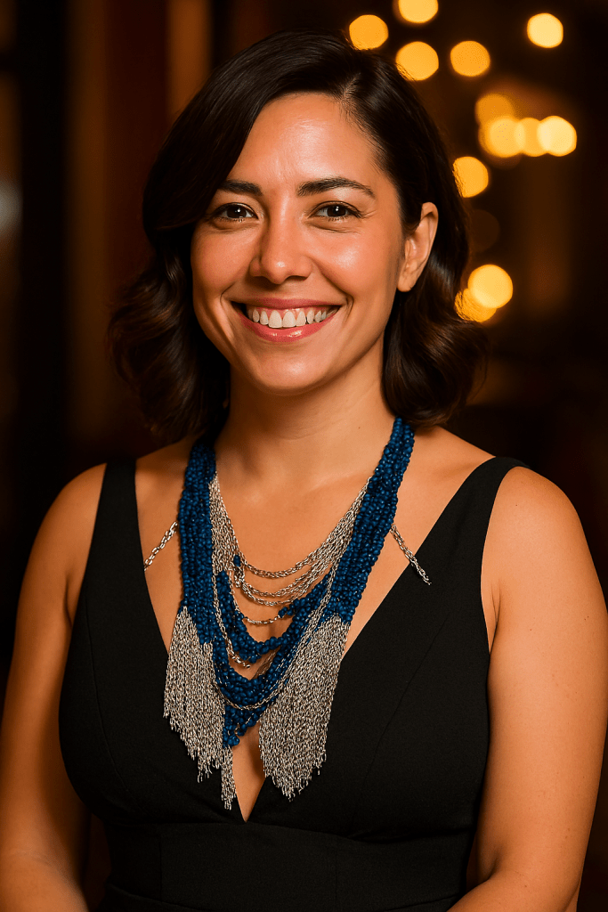 Against a black gown and golden bokeh, the necklace glows like moonlight. The lavender rings add mystique, and the silver fringe dances with every breath. It’s elegance with a story.