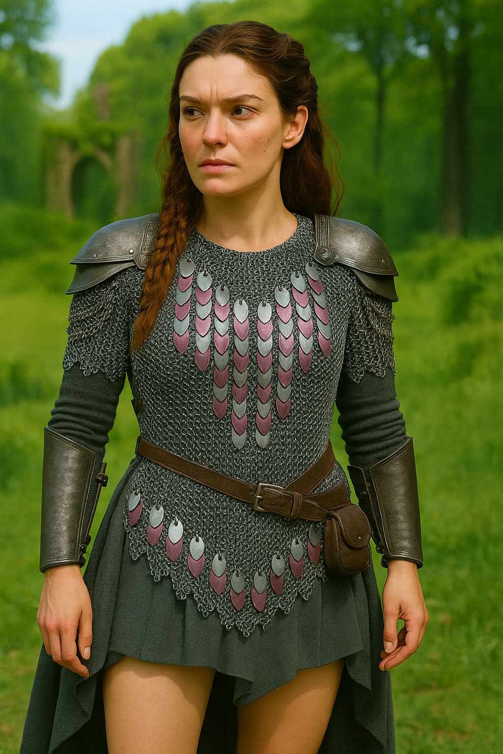 Grey European 4-in-1 Chainmaille with Mauve and Grey Dragonscale over-piece for Cosplay. Called Moonshard