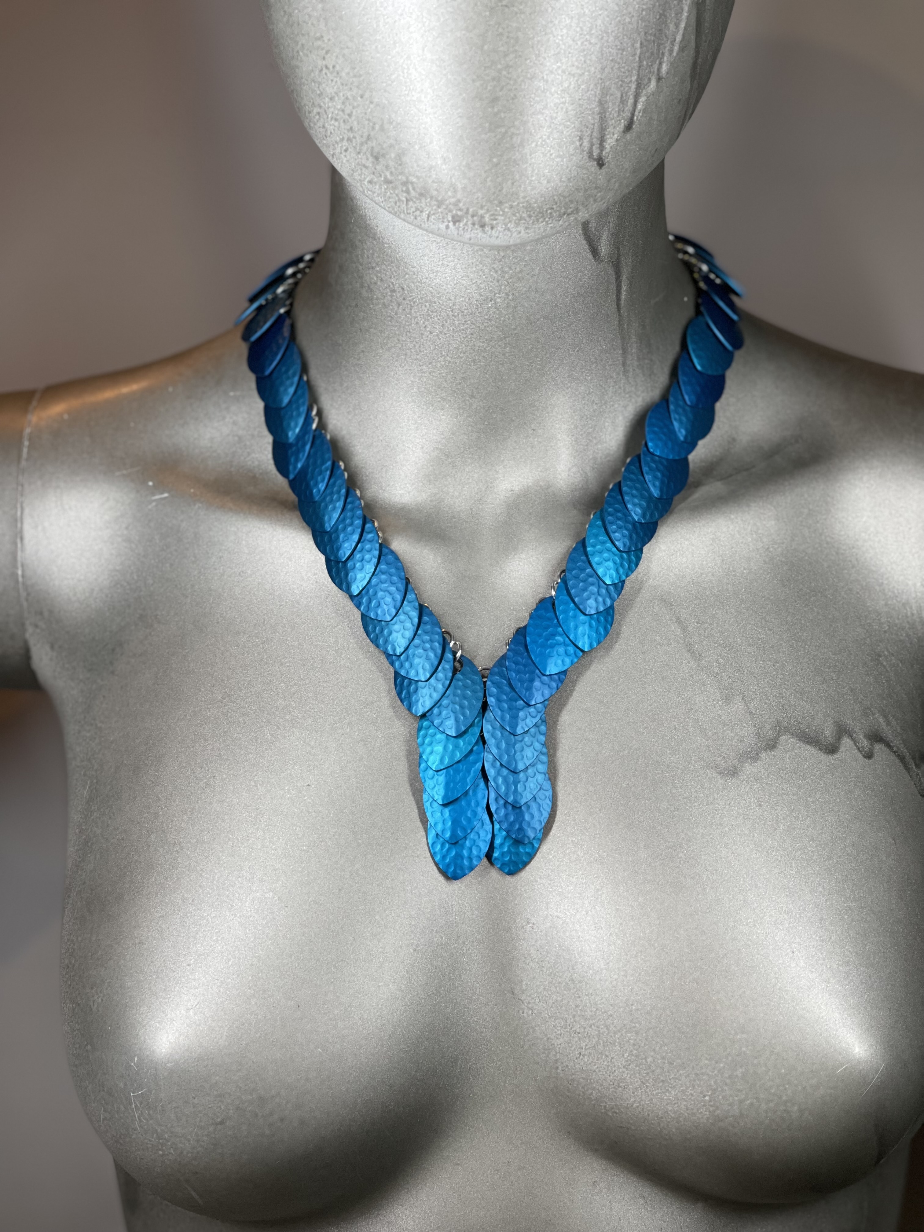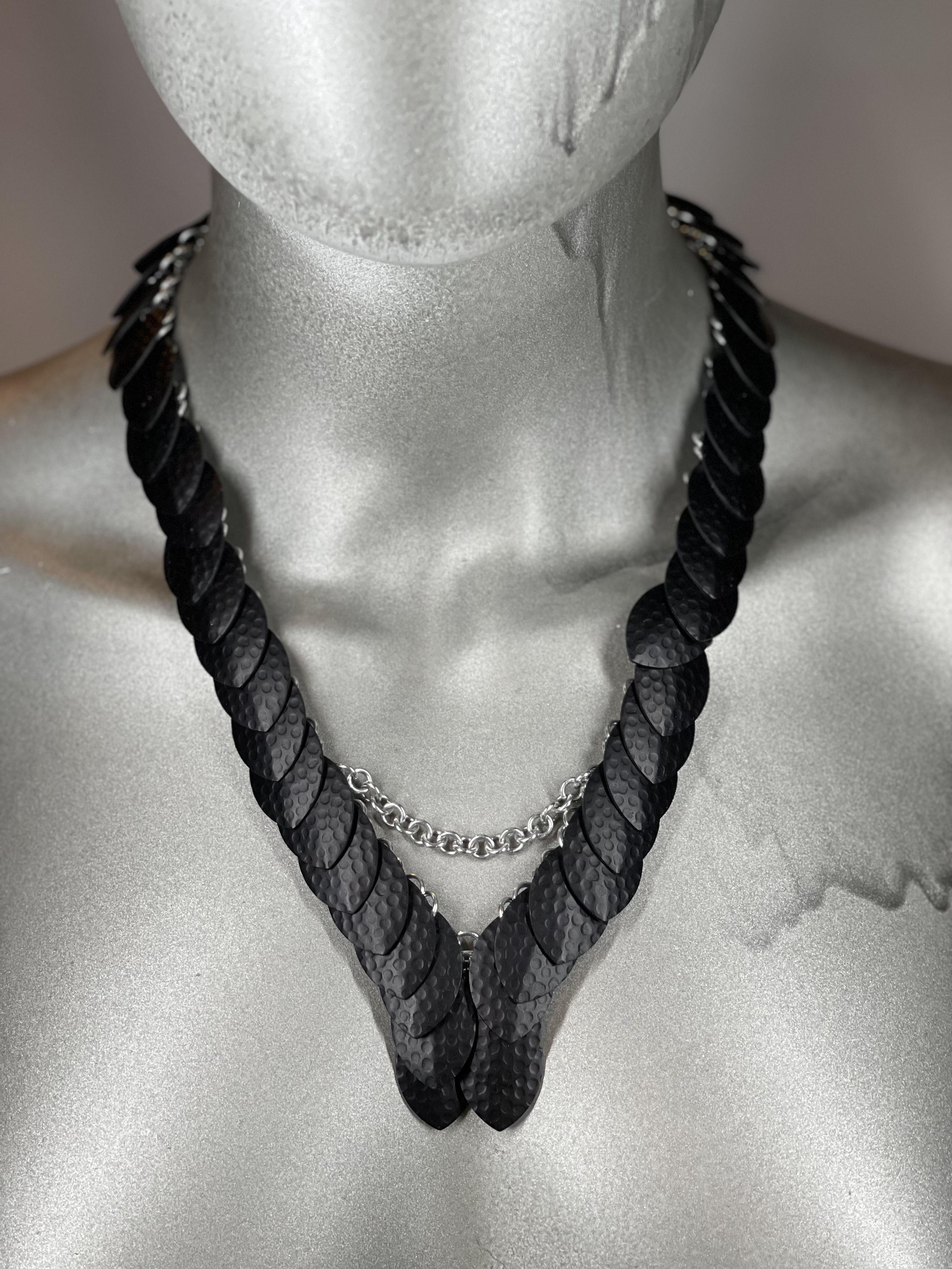 Anodized Aluminum Dragonscales overlap and form a V with elegant precision in colors that are vibrant and permanent, resistant to fade or chip. Color: Matte Black measures 20″ with draping silver chain not show on AI image.