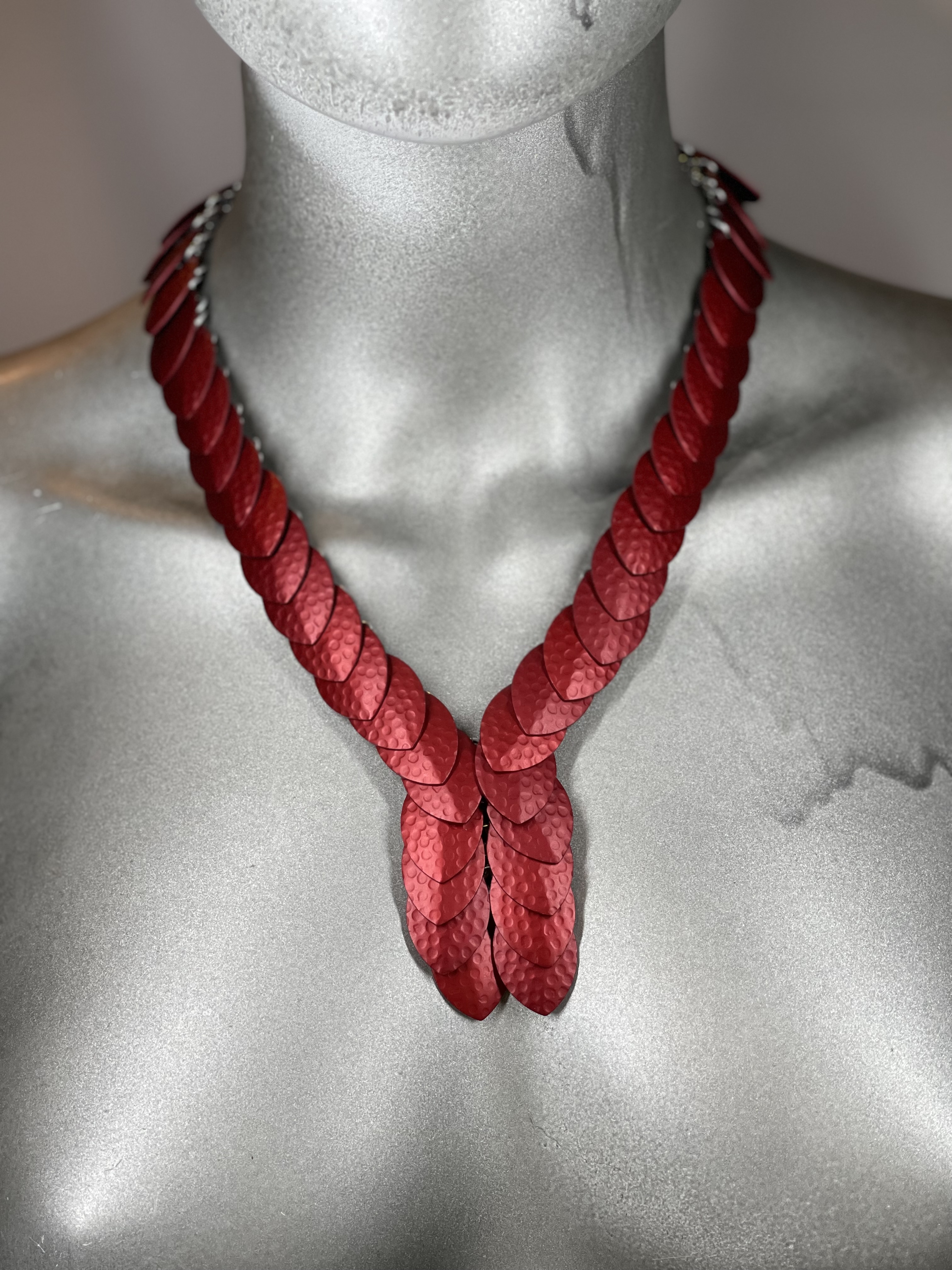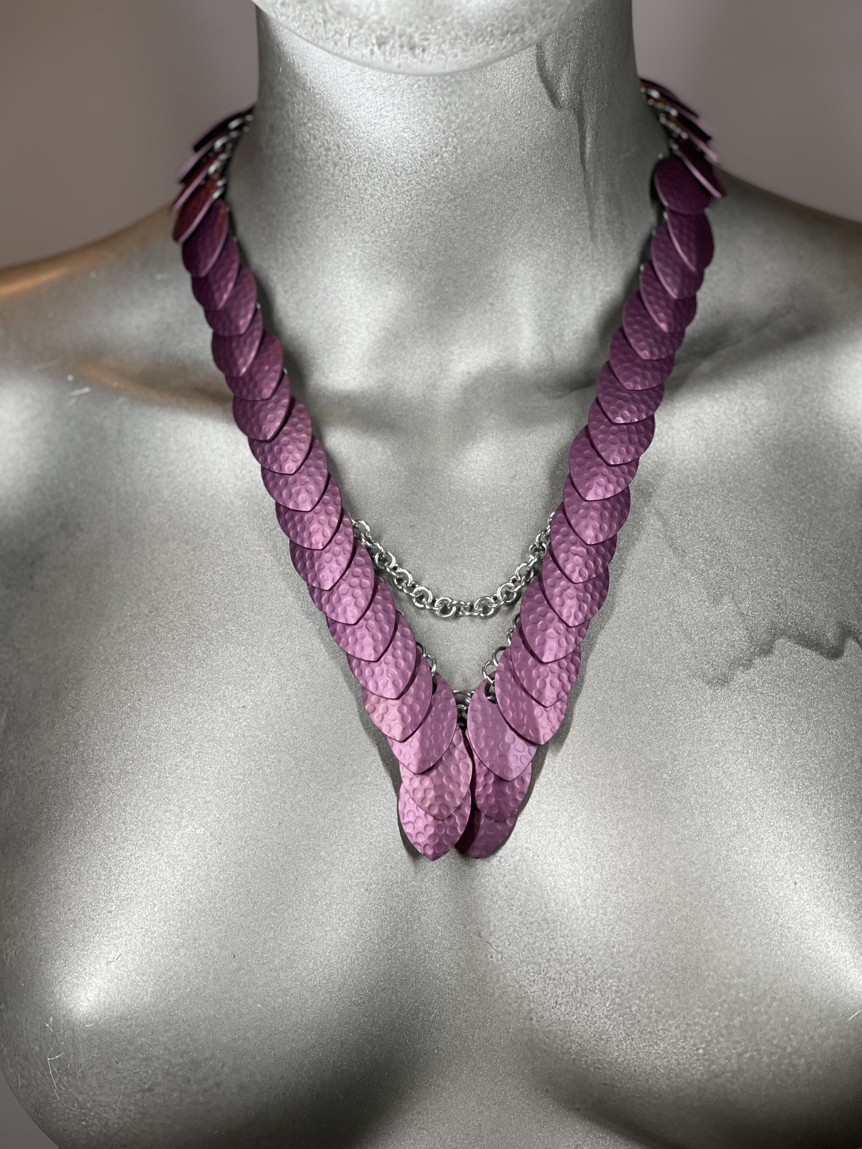 Anodized Aluminum Dragonscales overlap and form a V with elegant precision in colors that are vibrant and permanent, resistant to fade or chip. Color: Mauve measures 20″ with draping silver chain not show on AI image.