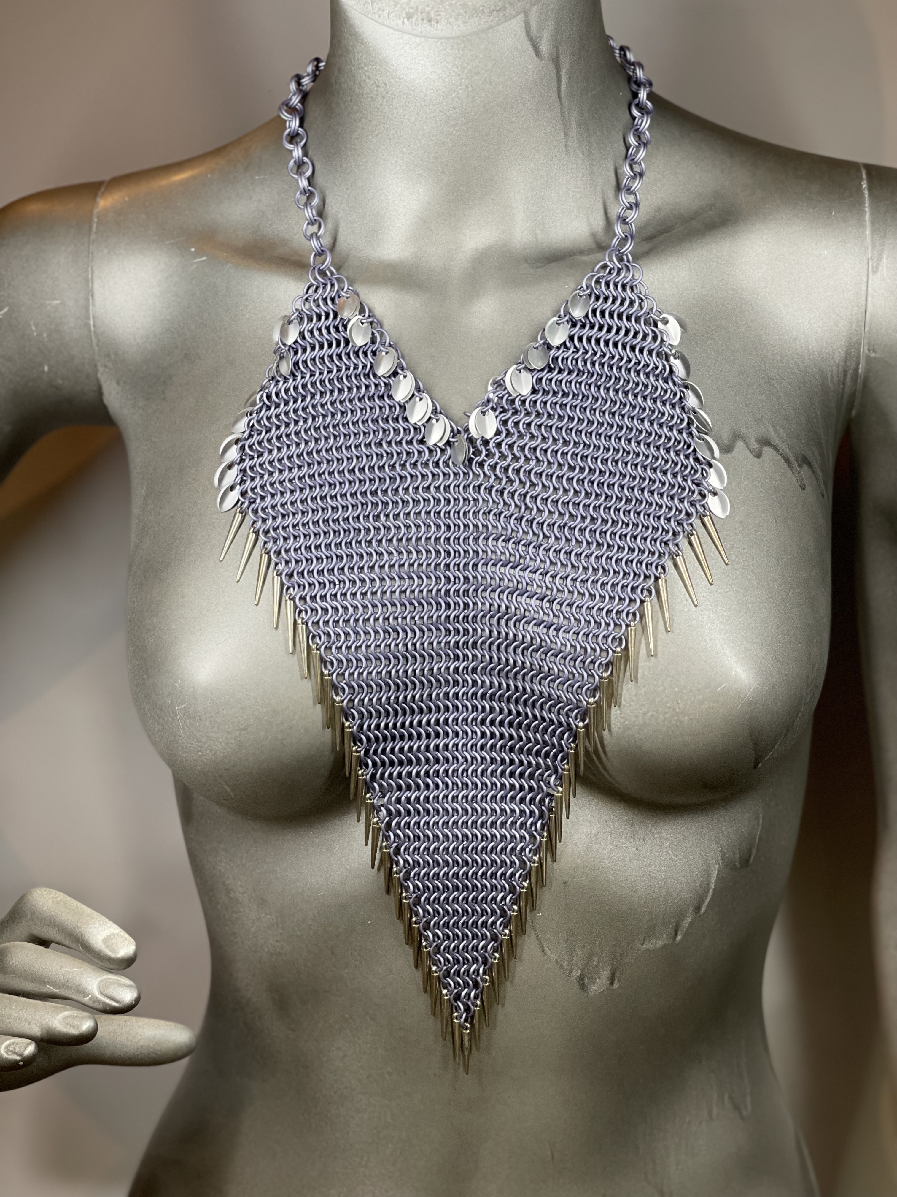 Handcrafted with Anodized Aluminum rings, this Chainmaille necklace is nothing less than a statement. In lush Lavender, with tiny silver Dragonscales and shimmering silver spikes. Bold, sharp and commanding, held together with a traditional lobster clasp in colors that will never fade or rub off.