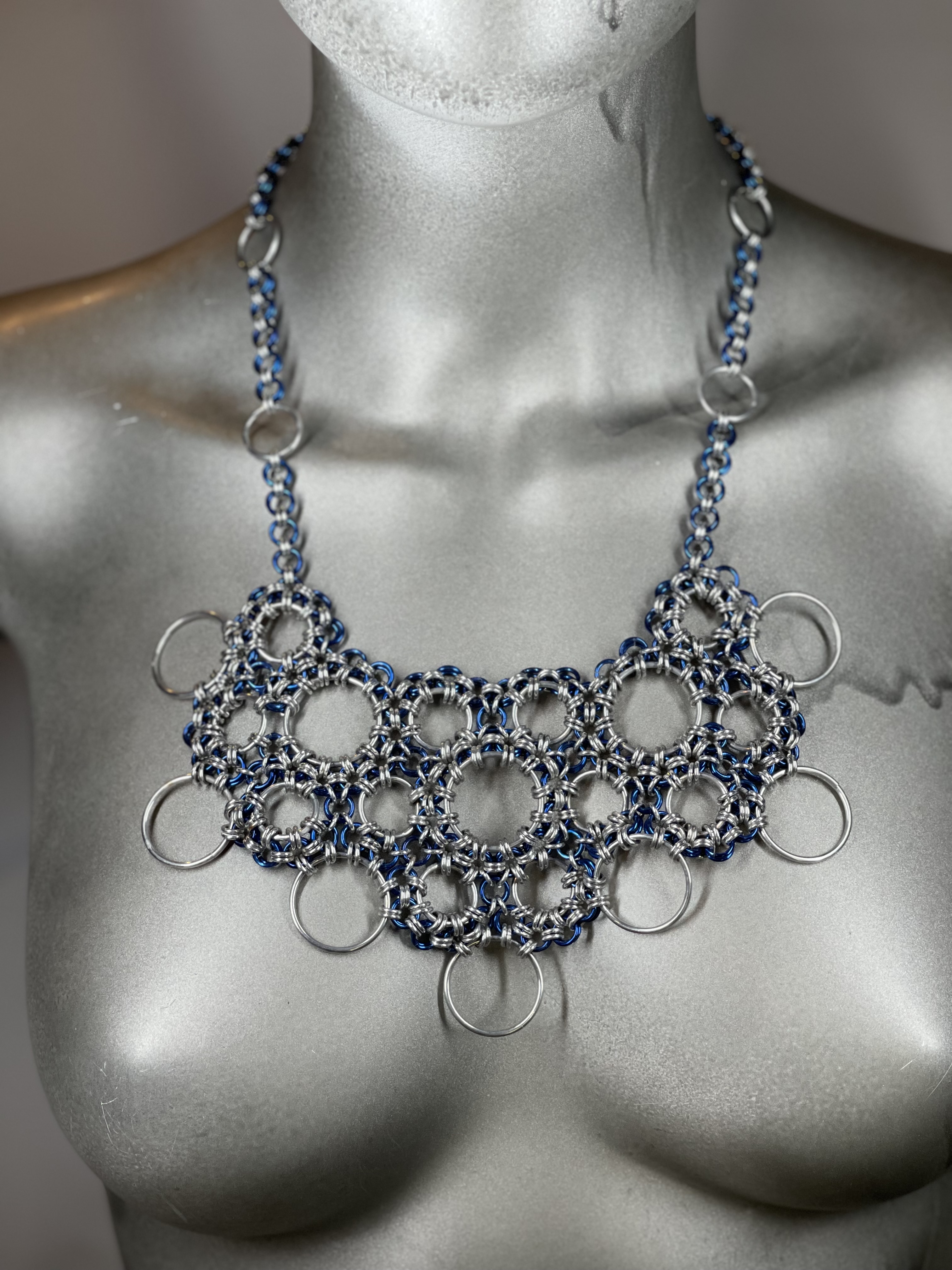 This Japanese chainmaille necklace in silver and blue is designed as regal statement wear. Structured, radiant and bold