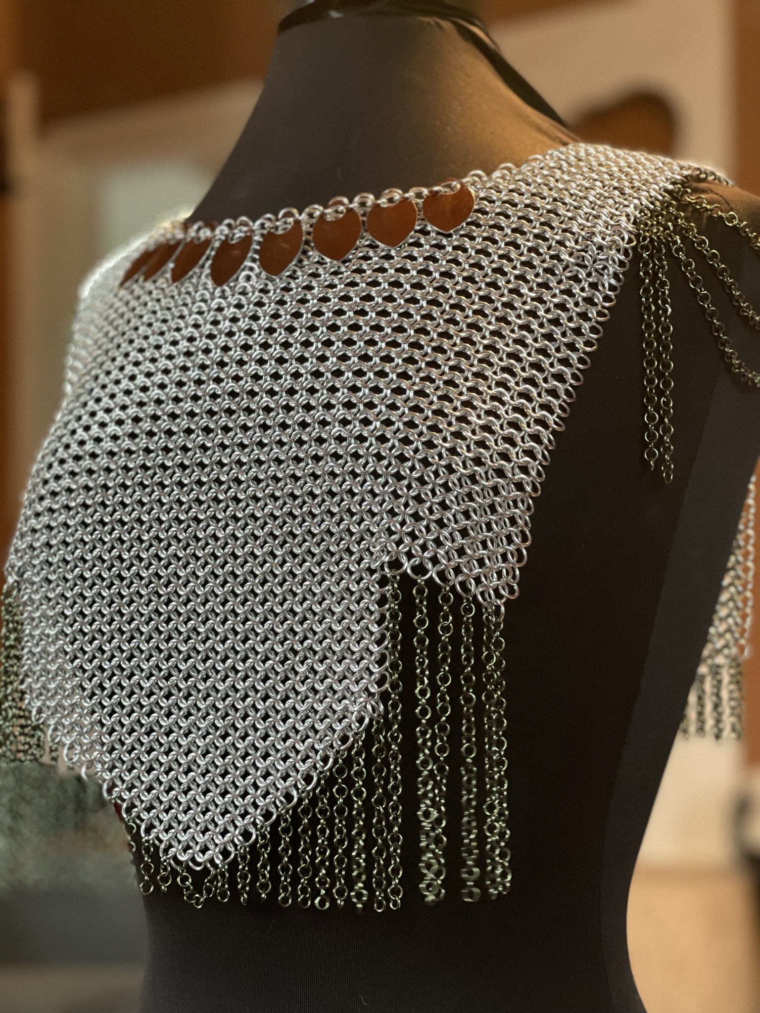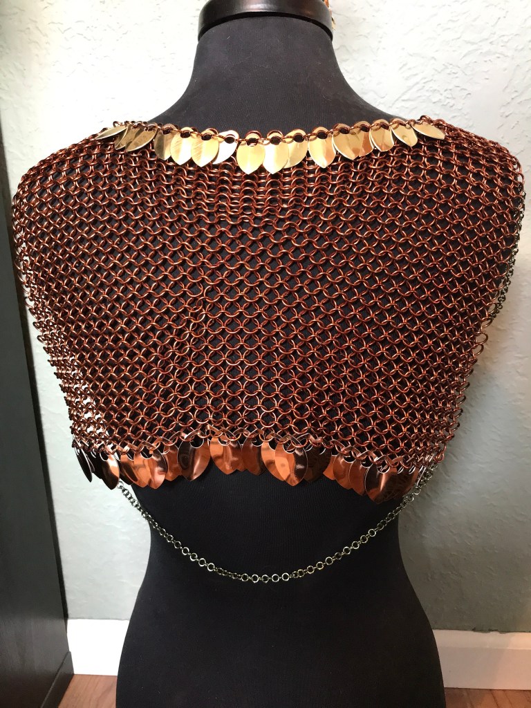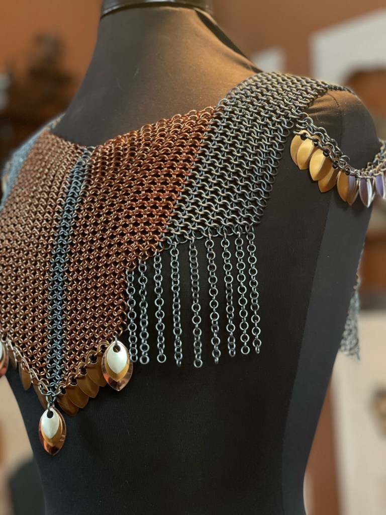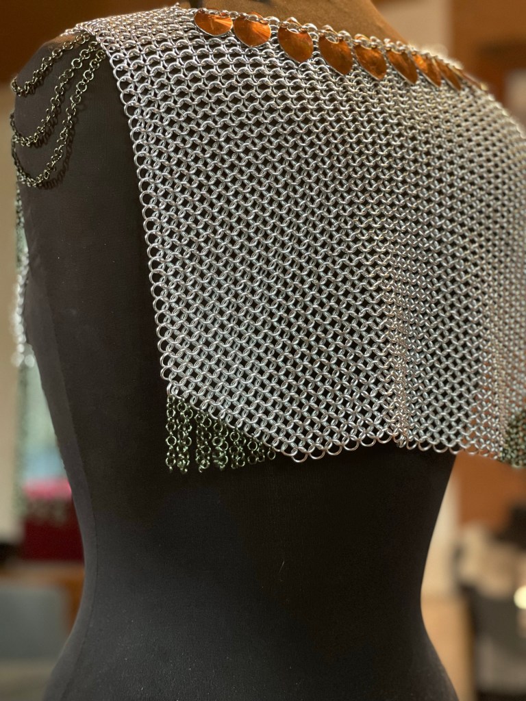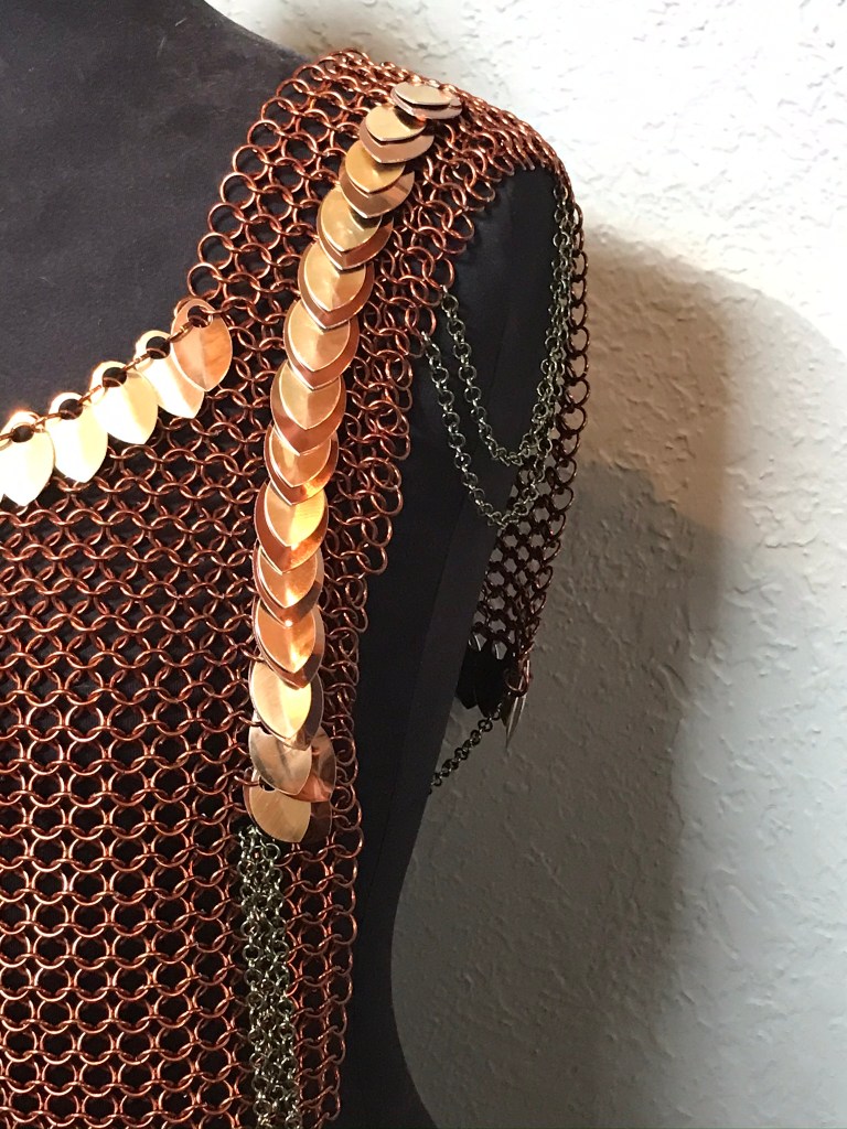 Matte Green with Henna and Silver Dragon scales. One shoulder scaled, one shoulder draped.