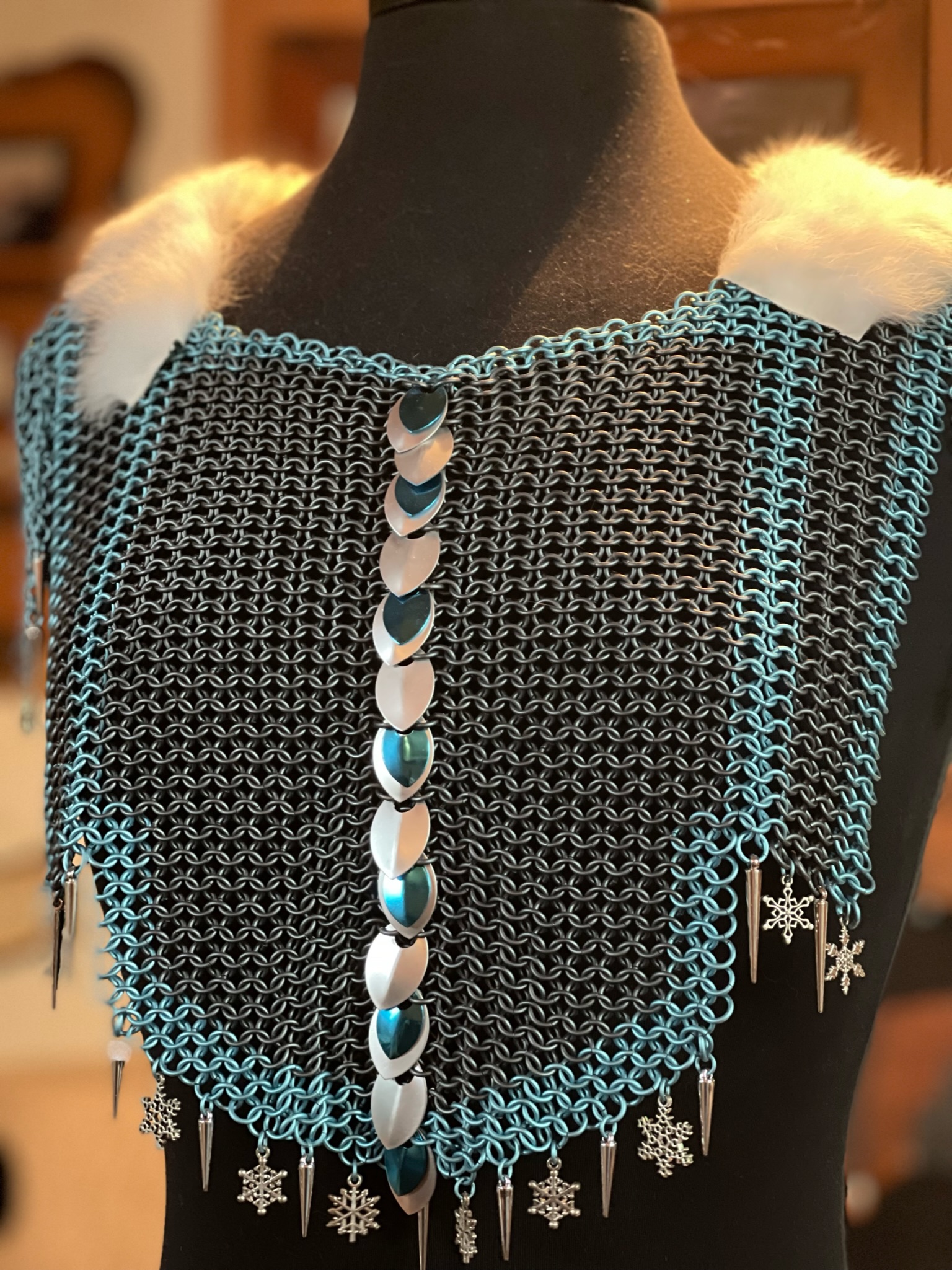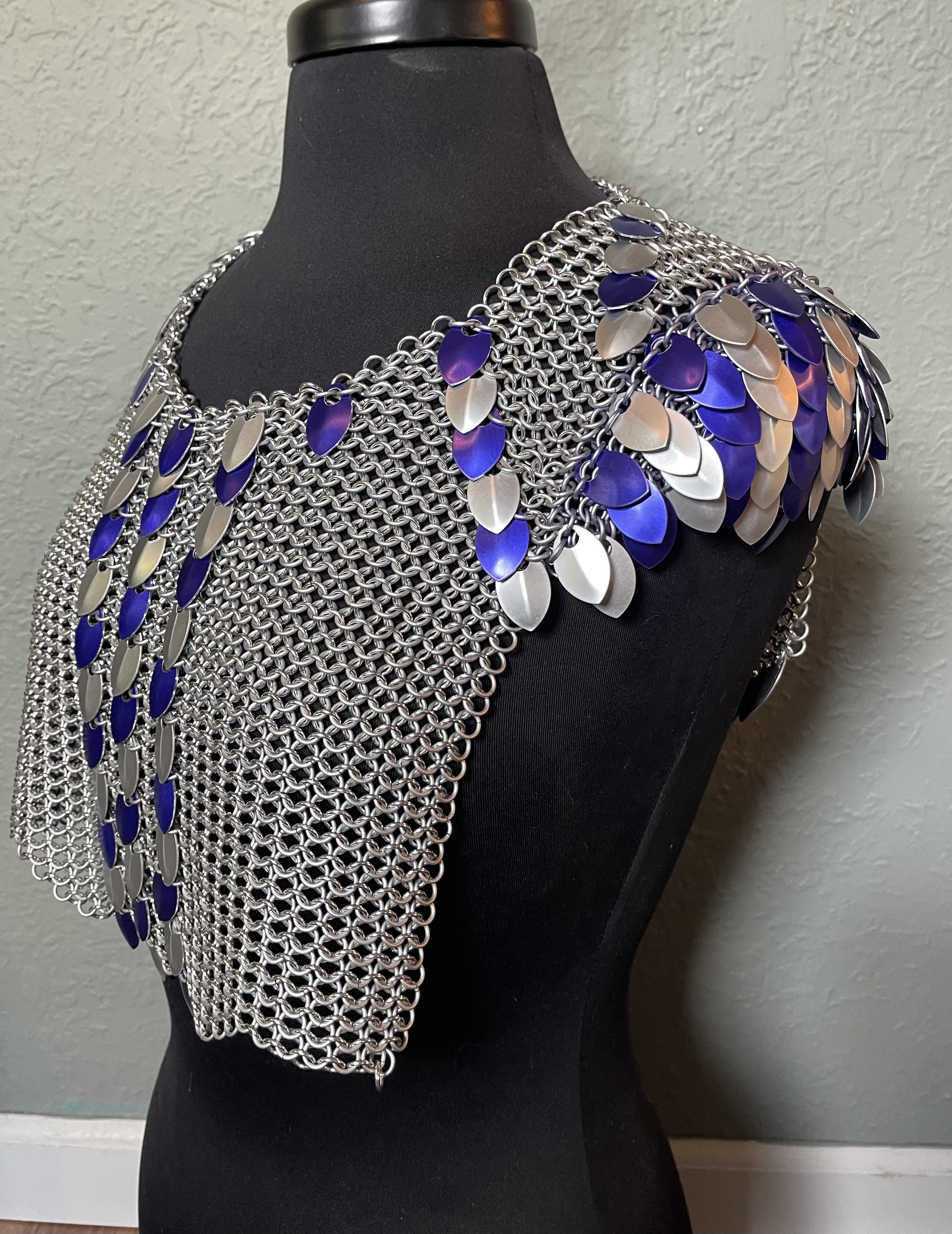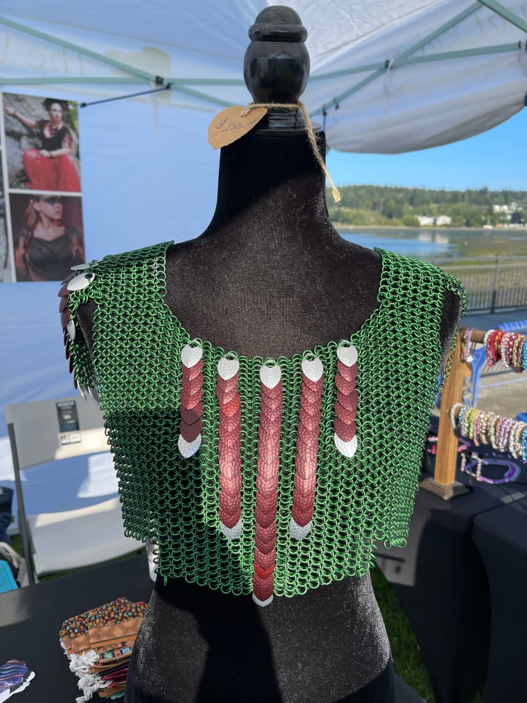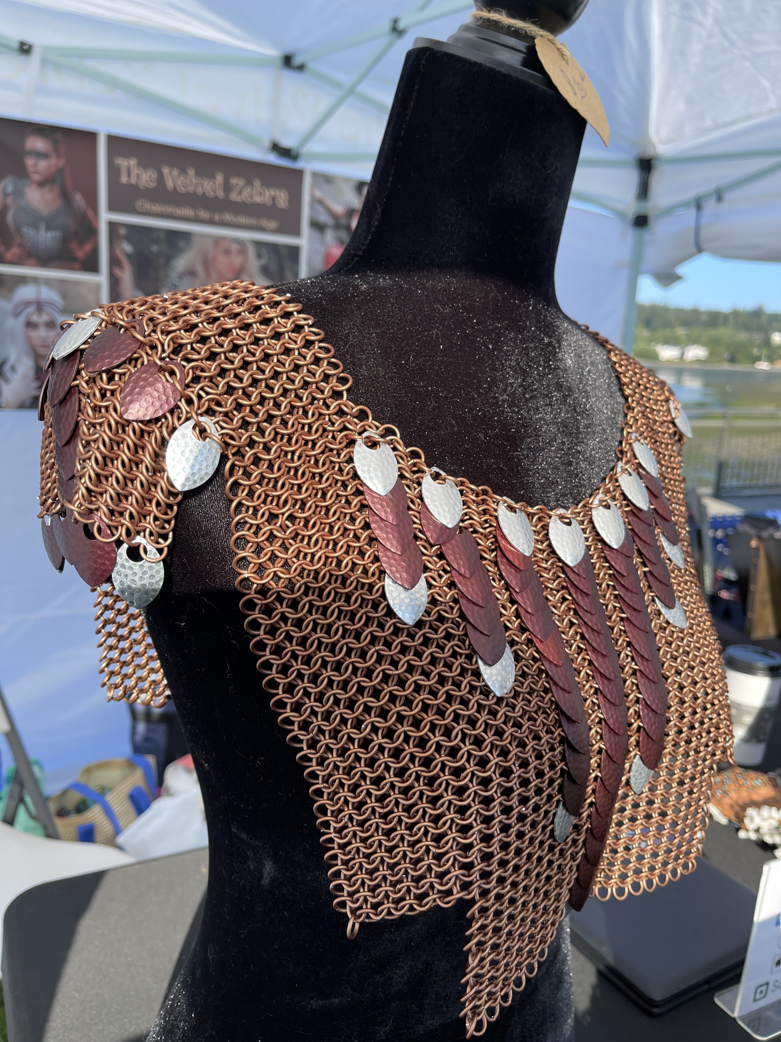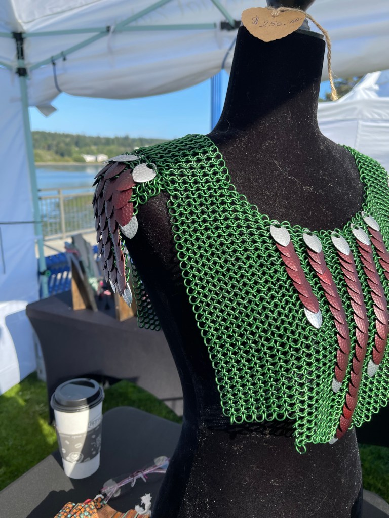 Matte Green with Henna and Silver Dragon scales. One shoulder scaled, one shoulder draped.