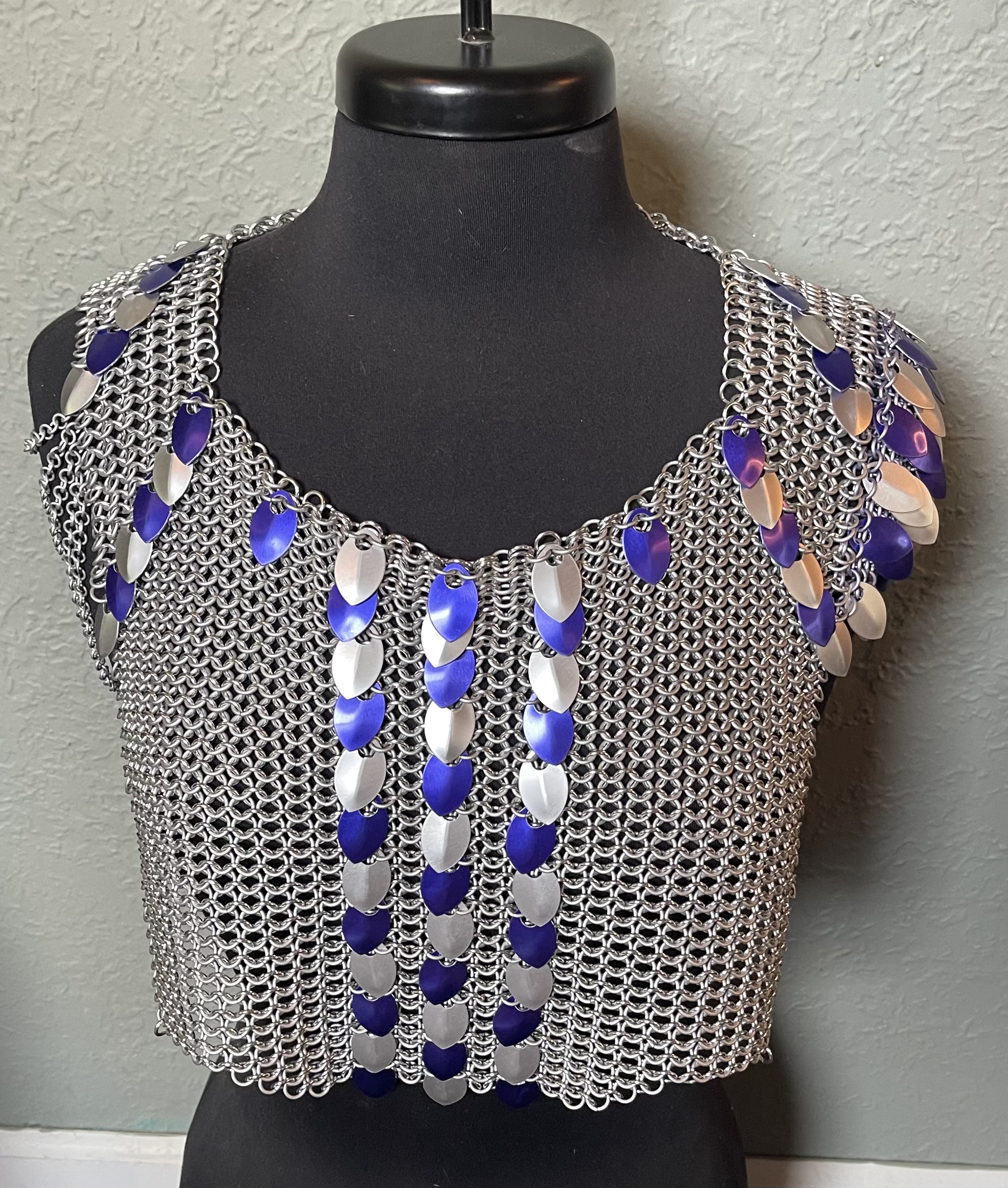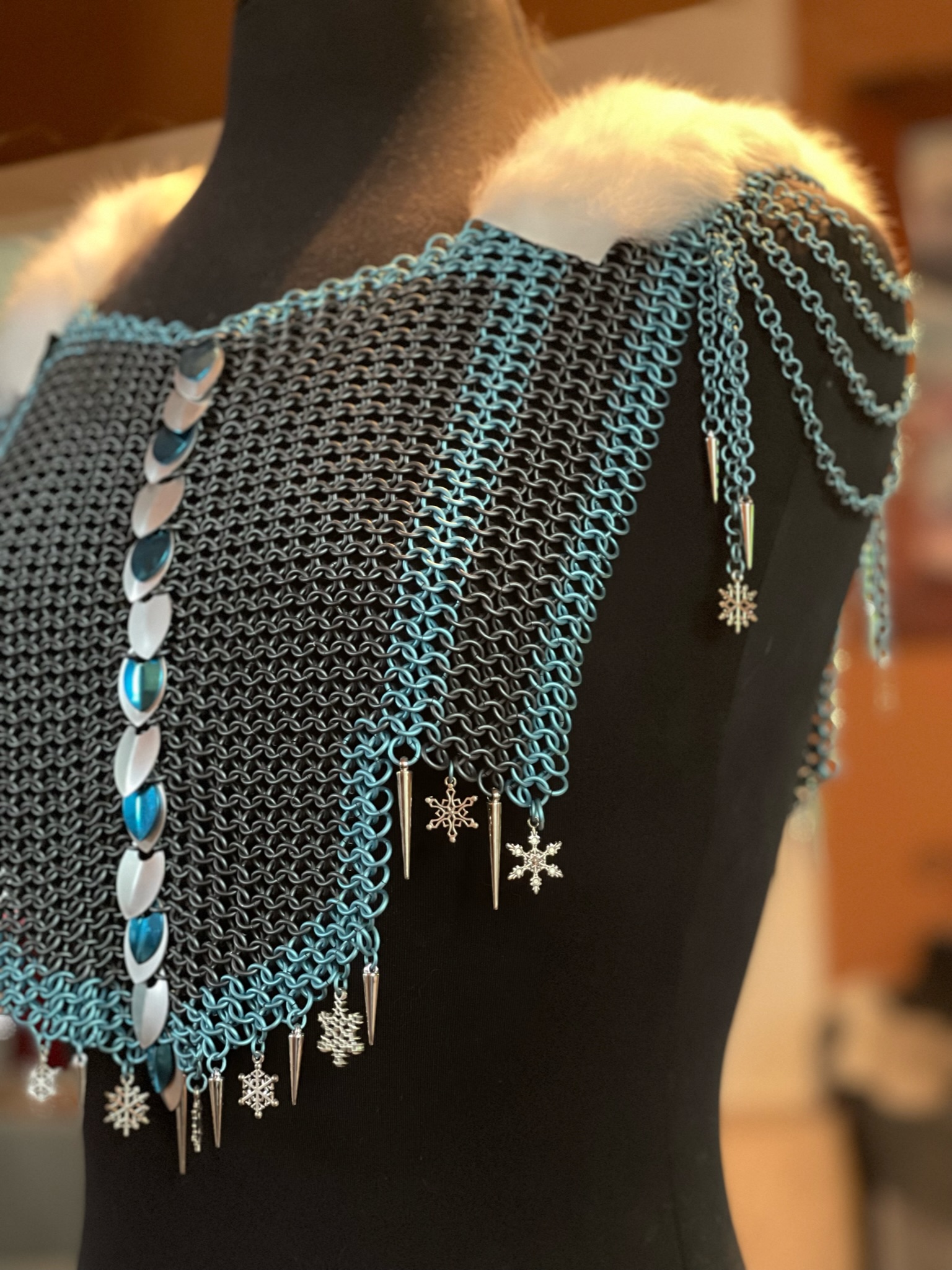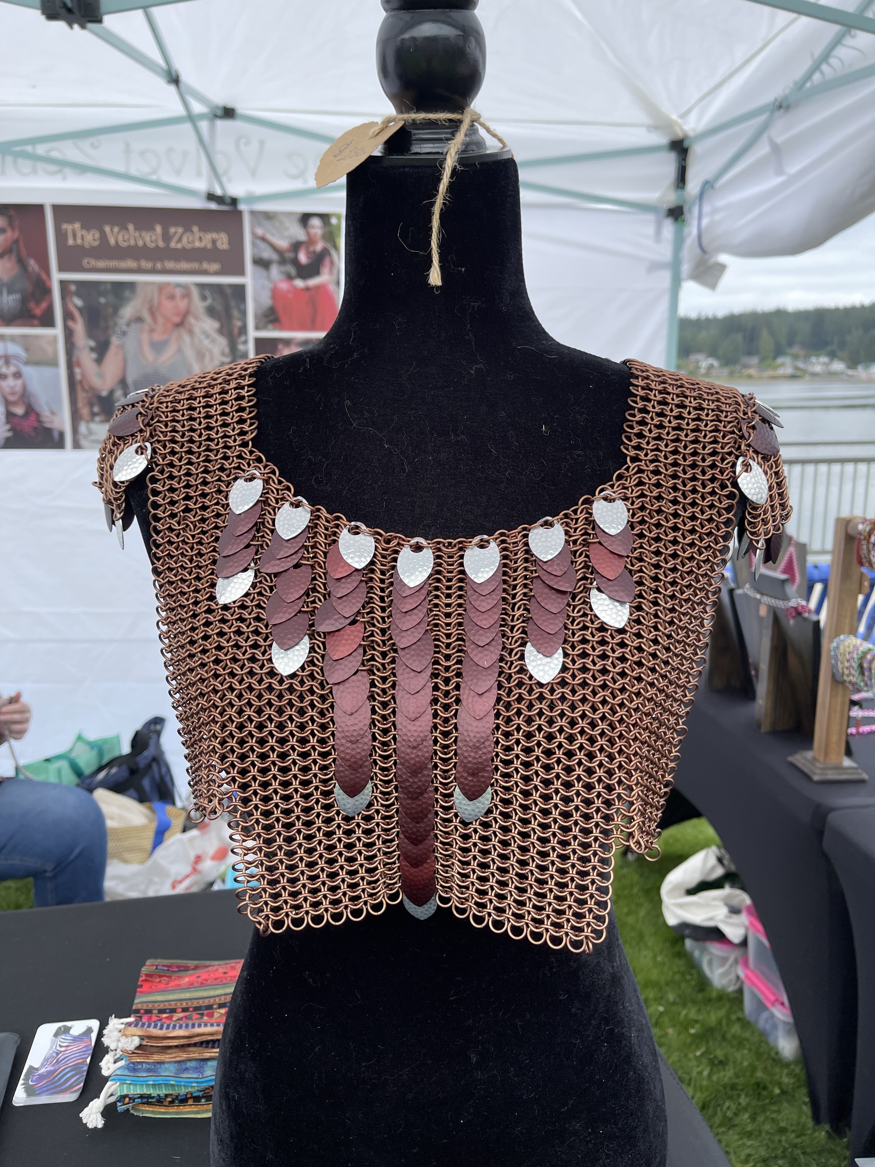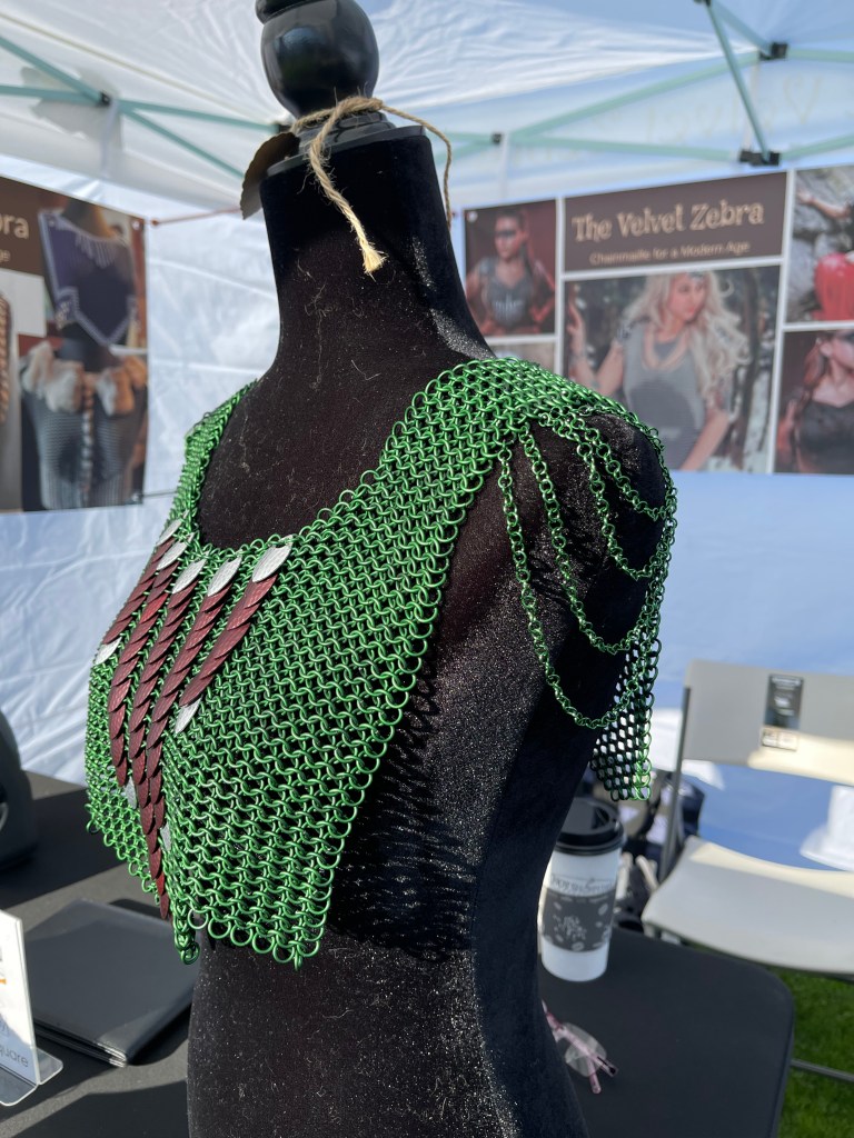 Matte Green with Henna and Silver Dragon scales. One shoulder scaled, one shoulder draped.